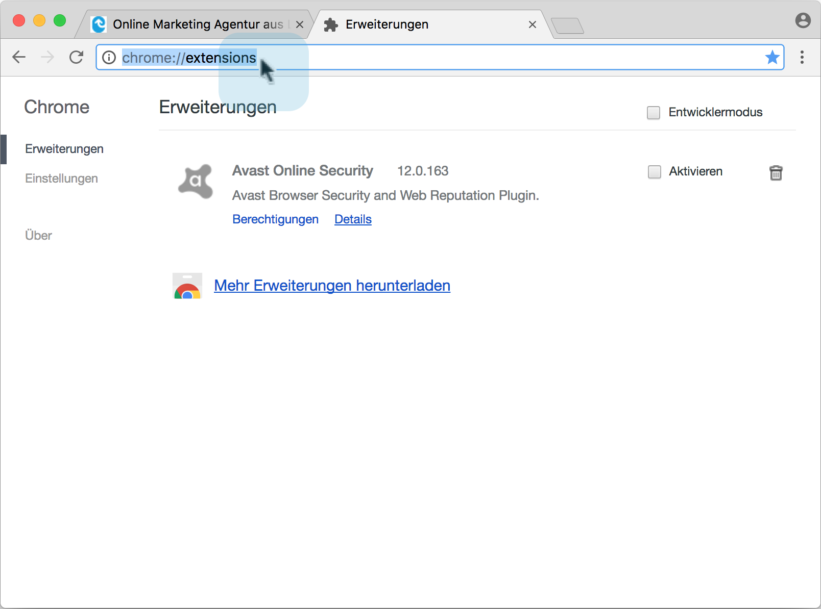 Im Chrome-Browser gebe man oben in der URL-Zeile chrome://extensions ein.