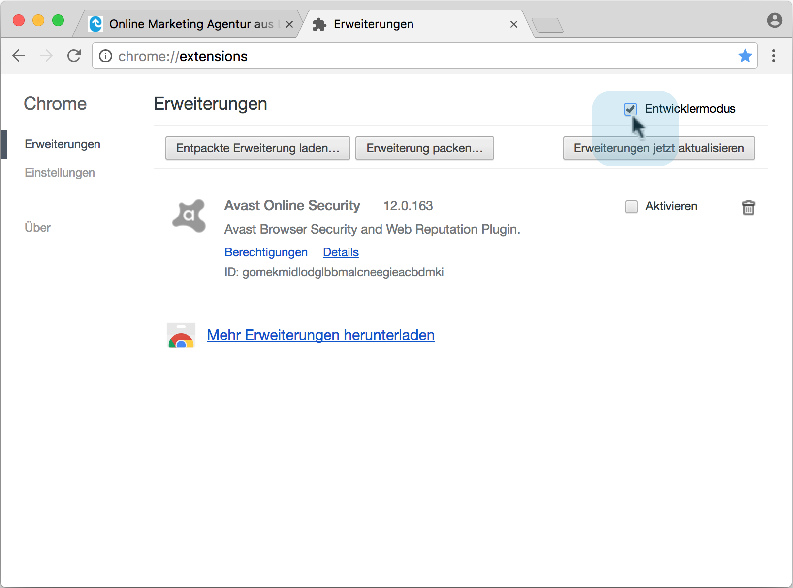 Oben rechts dem Kontrollkästchen Entwicklermodus ein Häckchen setzten.
