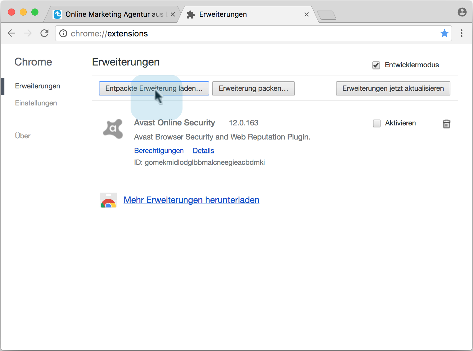 Den Knopf Entpackte Erweiterung laden... klicken,