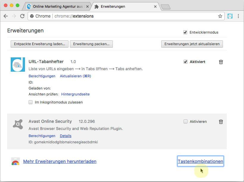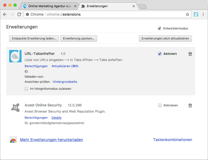Oben rechts dem Kontrollkästchen Entwicklermodus ein Häckchen setzten.