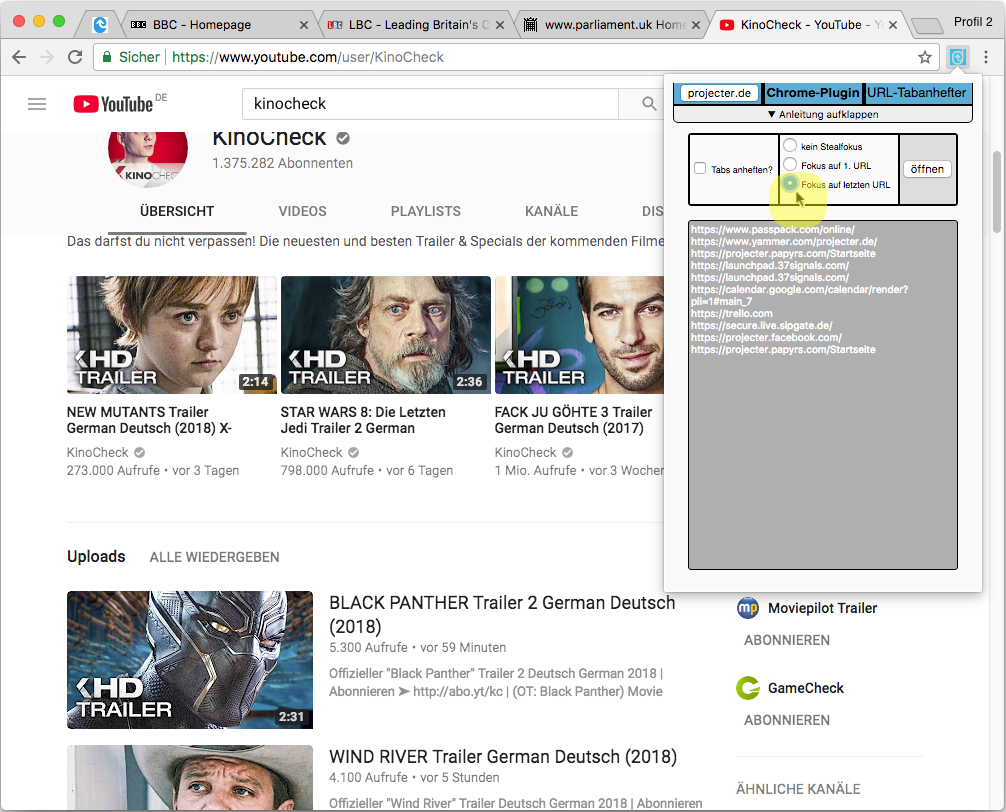 URLs in angehefteten Tabs öffnen \& Wechsle auf den Tab des letzten URLs: